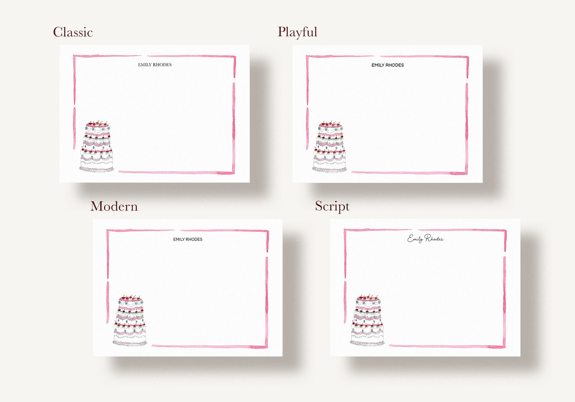 Sweet, simple, and ready for celebrating—these cheerful cards feature a hand-drawn tiered cake with cherries on top and playful red-and-pink stripes around the border. The back is sprinkled with tiny cherries for a whimsical finish. Perfect for birthdays, thank-yous, or any message worth a little extra frosting.