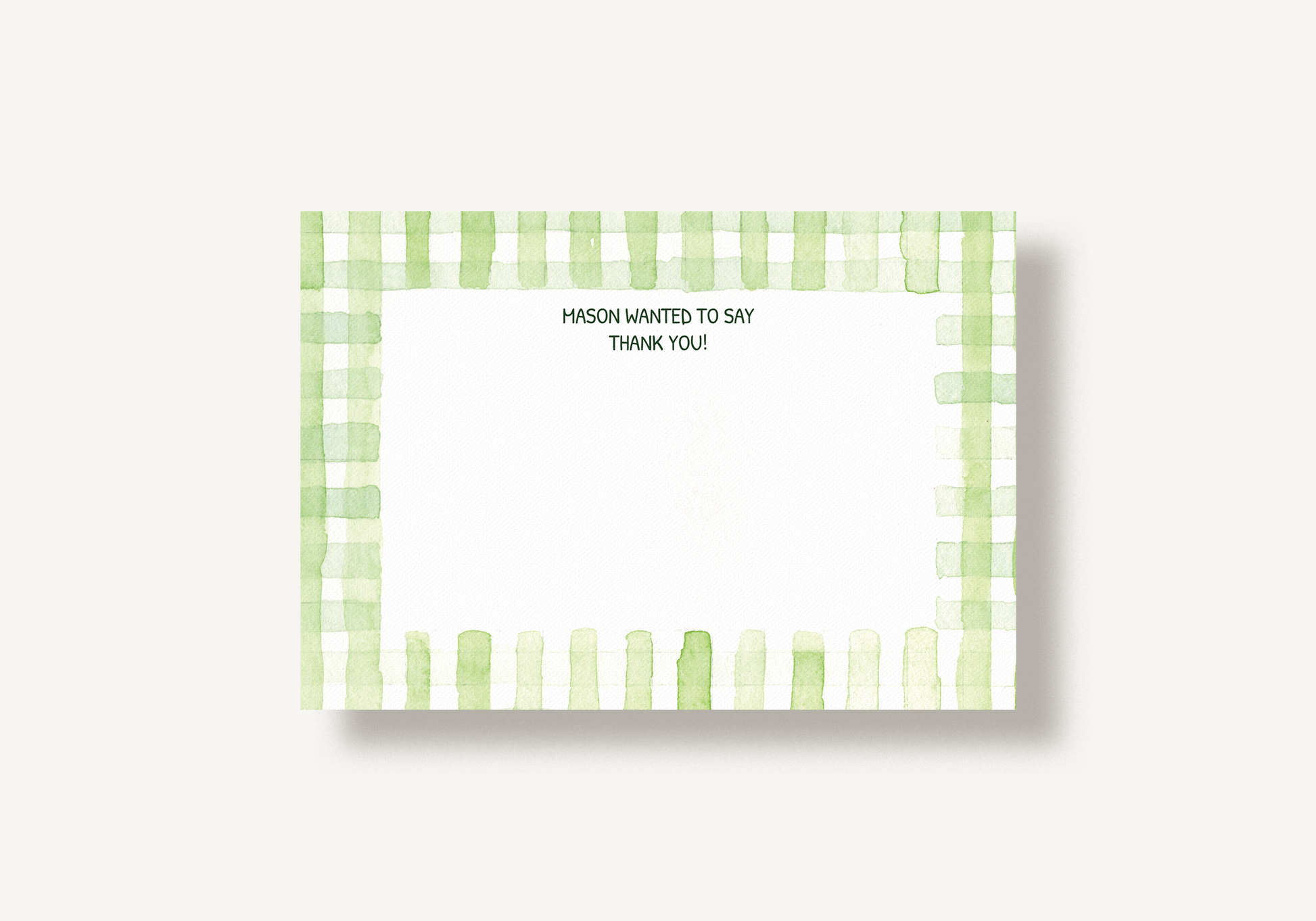 Fresh, cheerful, and perfectly versatile. This hand-painted gingham design brings a playful touch to thank-yous, notes, and everyday hellos. Available on its own or paired with our Hole in One invitations for a coordinated look.